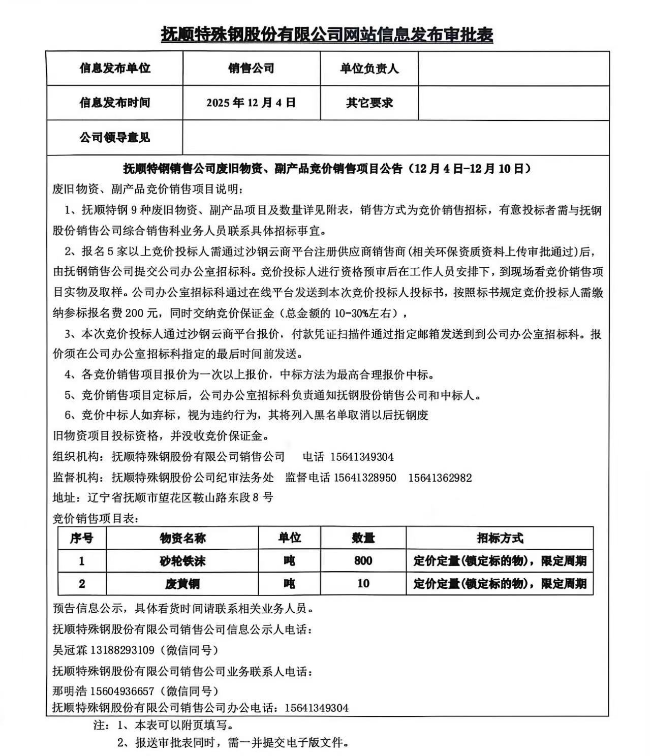 撫順特鋼銷售公司廢舊物資、副產品競價銷售項目公告(12月4日-12月10日)